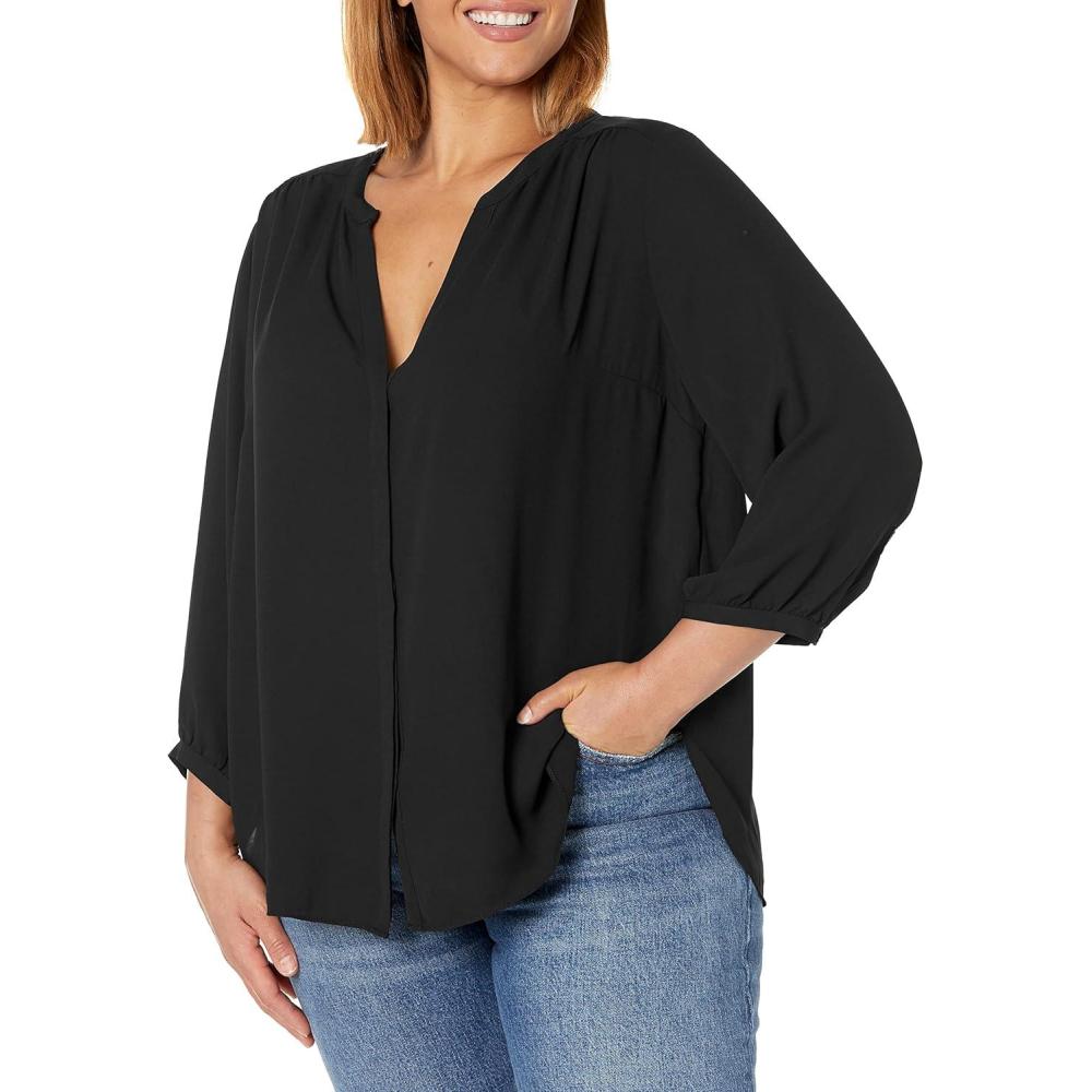 NYDJ's Pintuck Blouse boasts a billowy silhouette with three-quarter sleeves that's perfect when paired with any of our slimming women's denim styles. Pleating at the back yoke creates a sophisticated yet easy drape. Split round neckline with covered full front placket and button closure. Made of 100% Polyester. Machine wash cold, line dry. Length: 27.25″ (size M).